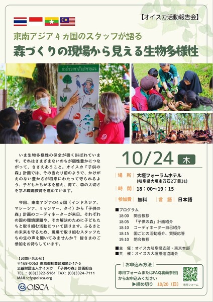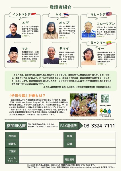 東南アジアの4ヵ国(インドネシア、マレーシア、ミャンマー、タイ)から森づくりのスタッフが来日し、それぞれの国の環境課題や、その解決のために子どもたちと取り組む活動について語ります。