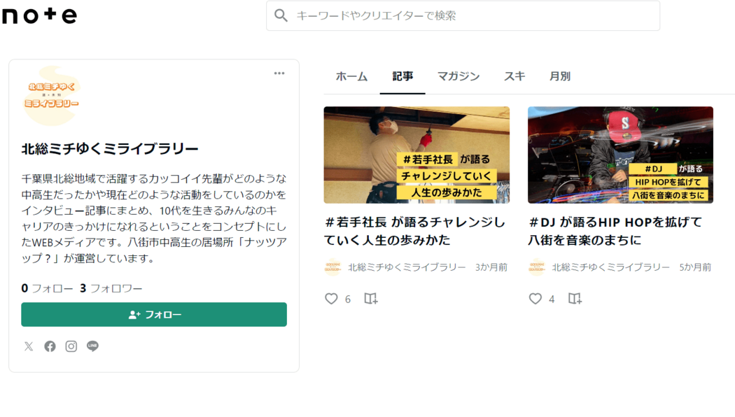八街市中高生の居場所『ナッツアップ?』が運営するnote「北総ミチゆくミライブラリー」のライタープロボノです。”会いに行ける先輩”をコンセプトに地域で活躍する若者のインタビュー記事を執筆・公開します。