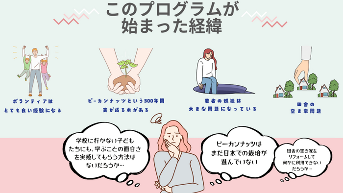活動地となる地域には、地域の空き家、高齢化、耕作放棄地、そして子どもの孤独など様々な問題が複雑に絡み合っています。この問題群に挑むための新たな武器として、300年を実をつけるナッツに着目しました。