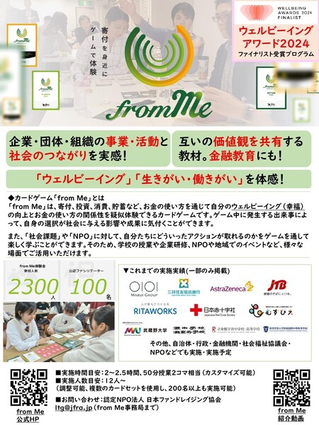 現代社会では、お金の使い方や価値観が多様化し、人々の幸福感や社会とのつながりが見直されています。カードゲーム「from Me」を使用した体験会は、寄付・投資・消費・貯蓄などのお金の使い方を通じて、参加者が自分自身と社会との関係を深く考える機会を提供します。この活動は、人々がより良い未来を創造するための意識変容を促し、社会全体のウエルビーイング向上に貢献します。