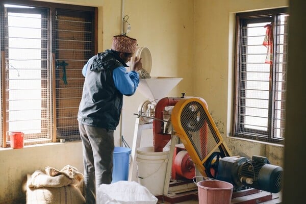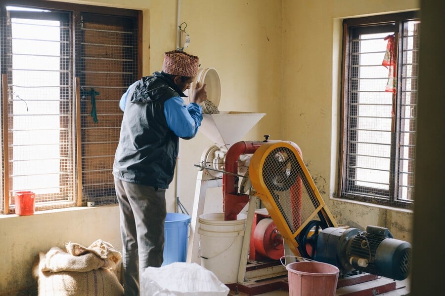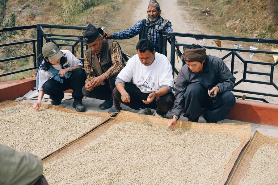 ポカラから約1時間のところにあるハルパン村。ここでは、生活の中の農業でコーヒーを栽培しています。村内でも力を入れてコーヒー栽培をしているガンガさん宅には、村中で収穫されたコーヒーチェリーが集まり、水洗処理方式の精製とパルパーでの果肉除去、天日干しを行っています。