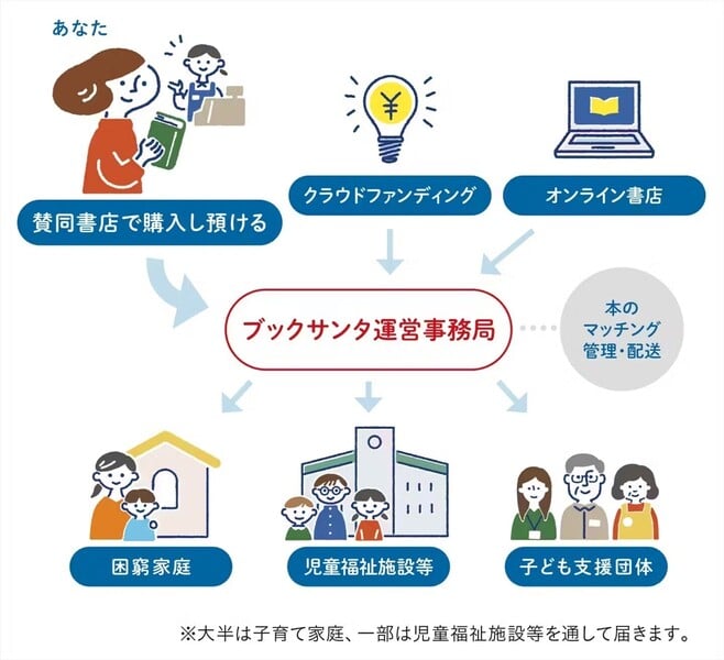 ブックサンタは、子どもたちの「体験格差」を解消するNPOが運営するチャリティー活動です。書店で新品の本を購入し、寄付することで、困難な環境にある子どもたちに本を贈ることができます。