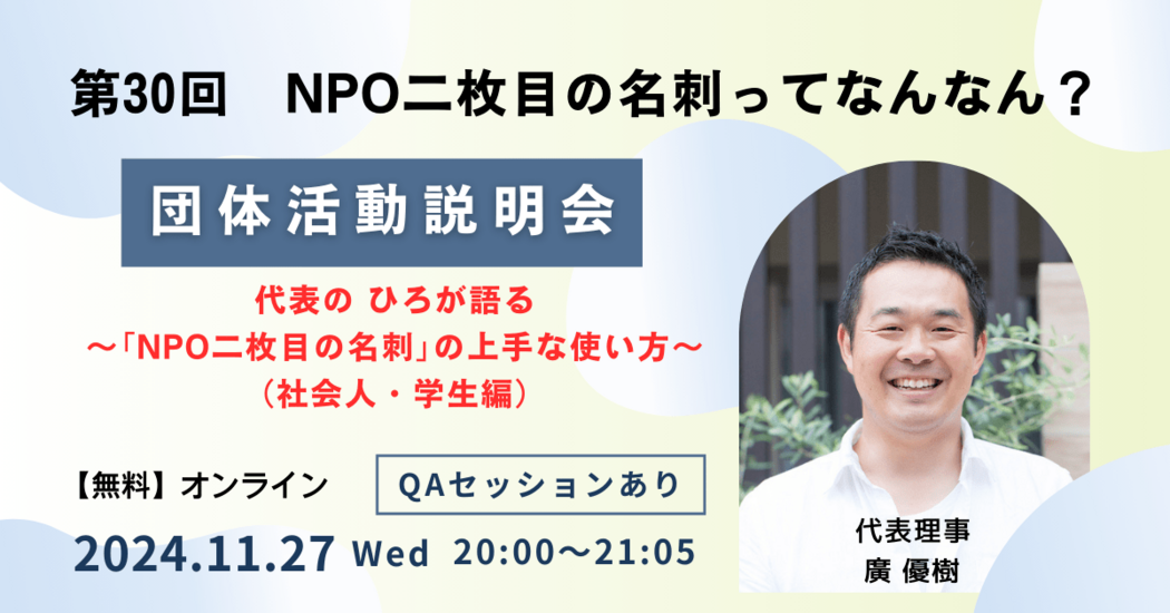 想いで繋がる“プロボノ”「NPO二枚目の名刺」は今年15周年。今回は、設立時から代表を務める廣優樹(ひろ ゆうき)が登壇し、社会人や学生の方へNPO二枚目の名刺を上手に使って頂く方法をお伝えします。