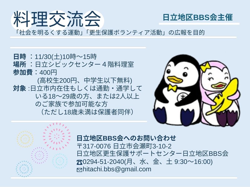 24年11月30日(土)9時00分頃に日立市シビックセンター料理室へ集合下さい。当日の料理交流会ですが、保護司や保護観察官など更生保護の広報を目的とした関係者が集まります。 |