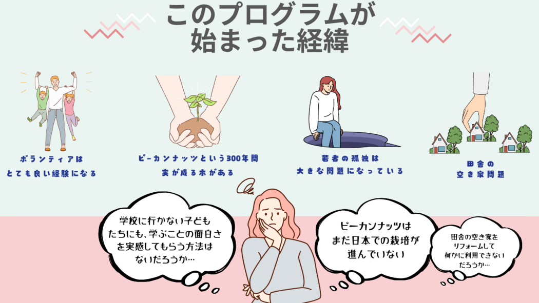活動地となる地域には、地域の空き家、高齢化、耕作放棄地、そして子どもの孤独など様々な問題が複雑に絡み合っています。この問題群に挑むための新たな武器として、300年を実をつけるナッツに着目しました。