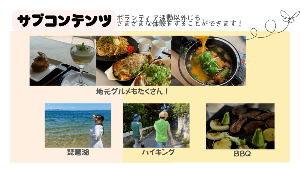 ボランティアの空き時間に琵琶湖に足を運んだり、自分たちもバーベキューを楽しんだり、星が綺麗な夜はうっかり活動地に宿泊したり、楽しく活動を行なっています✨