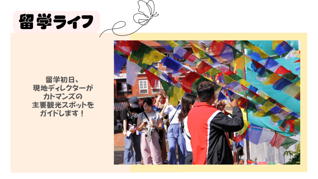 希望者は現地の家庭でのホームステイや、ヒマラヤ山脈のトレッキング、文化遺産巡りなどのネパール国内旅行を体験することもできます。語学とボランティアにとどまらない、幅広い学びと交流の場を提供します。