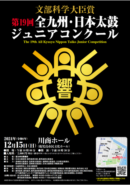 12月15日鹿児島市の川商ホール(旧市民文化ホール)にて、全九州Jr和太鼓コンクールが開催されます。子供達の演奏がスムーズに運営出来るよう、ボランティアスタッフ募集致します。是非宜しくお願いします!