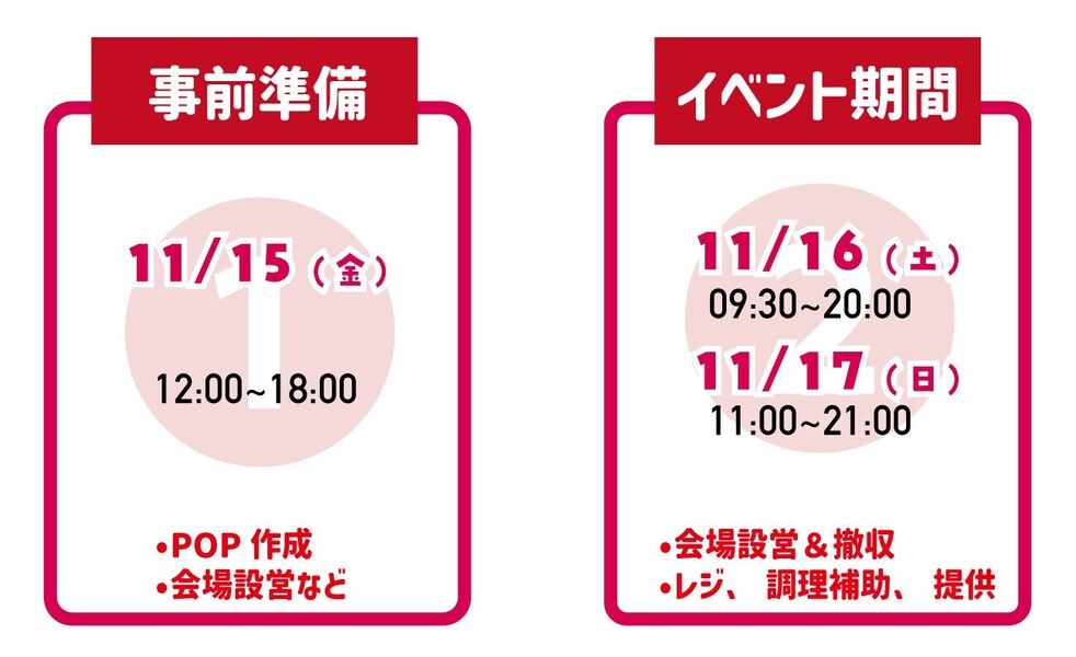 ※お手伝い頂ける日程と時間帯をお知らせ下さい。※事前準備期間は3~5名ほど、週末は10名ほどのお手伝いをお願いしたいです。
