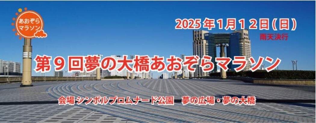 開催日2025年1月12日(日)開催場所東京 お台場 シンボルプロムナード公園 夢の広場・夢の大橋大会ホームページコースシンボルプロムナード夢の広場から夢の大橋を周回する1周1.25kmの 周回コース※会場の都合(工事など)によりコースが変更になる場合があります。