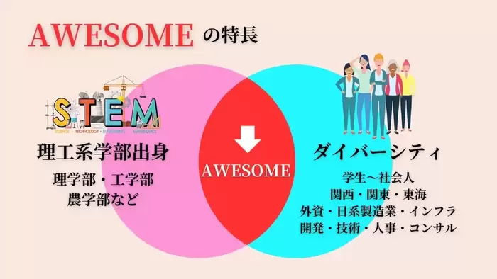 関西地域を中心に、関東・東海・四国地域から集まってきたリケジョたちは、理工系と言われる理学部・工学部・農学部などの進路を選択してきたという共通の部分を持ちながらも、年代や地域、そして経験してきたキャリアはダイバーシティに富んでいます。 AWESOMEだからこそできる、理系を選択することで得られる可能性や魅力について届けていきます。