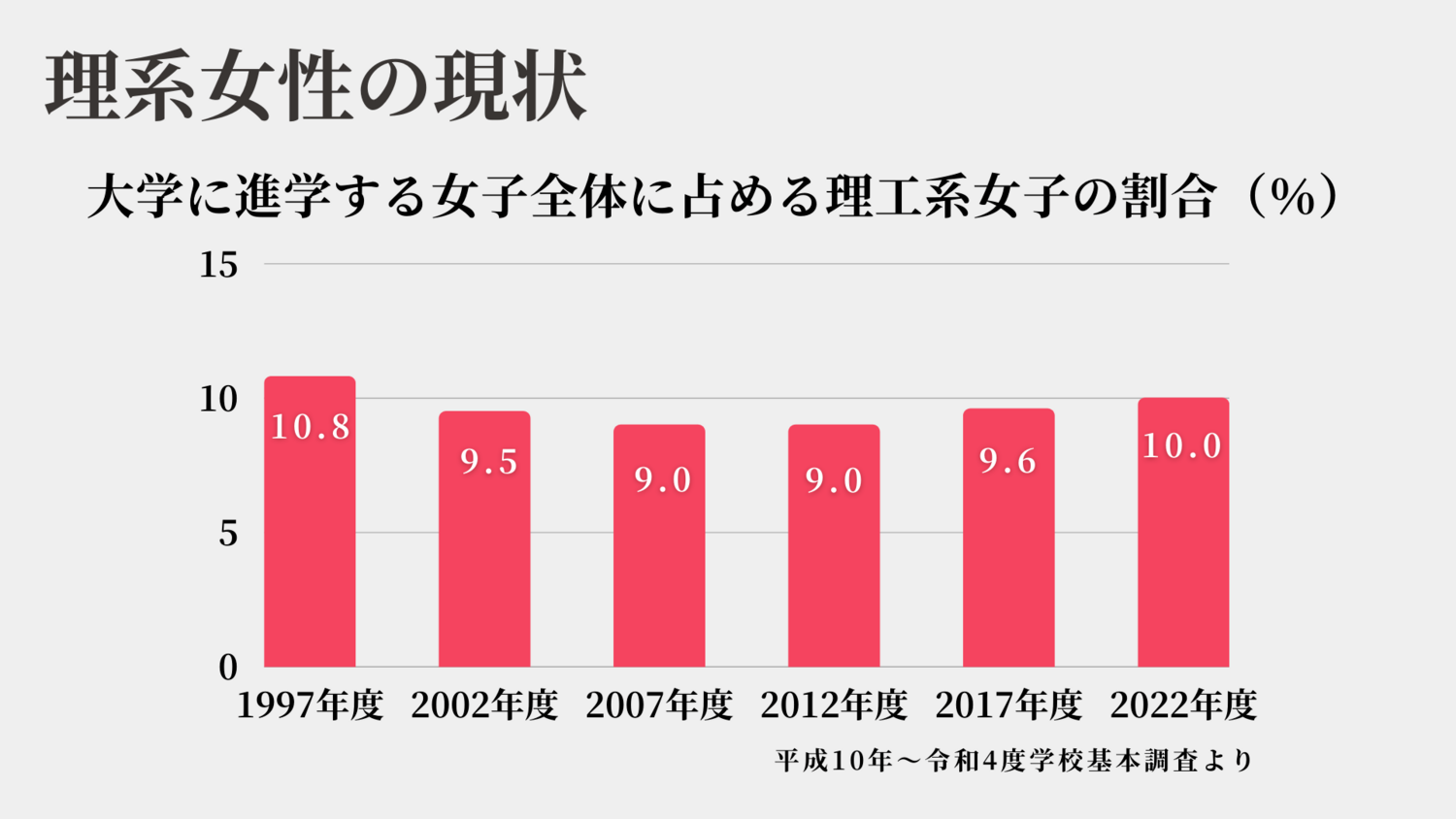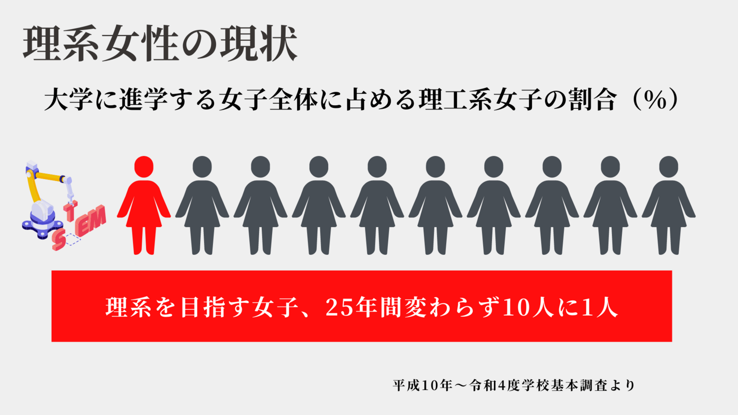 ①理系を目指す女子の割合、10人中1人。これは25年間横ばいのまま。
