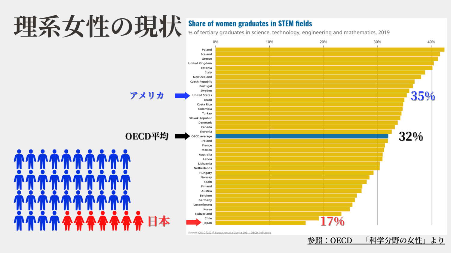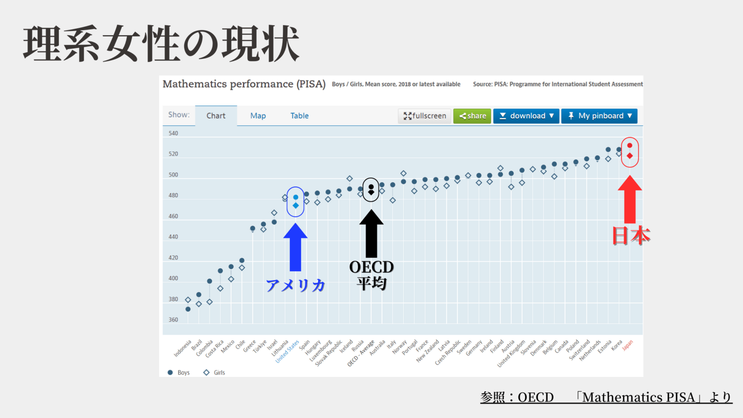 ②日本の女子の数学レベルは男子と差がなく世界トップレベルにもかかわらず、日本のリケジョの割合はOECD加盟国で最下位