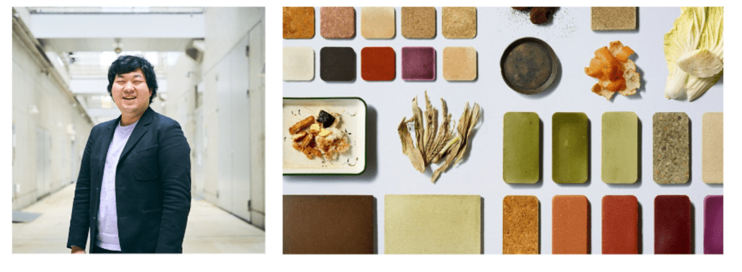 「ゴミから感動をつくる」をコンセプトに、規格外の野菜や食品加工時に出る端材などの食品廃棄物から、新素材を作っている東大発スタートアップ企業fabula。2021年10月に代表である町田紘太(まちだ こうた)を中心に、幼馴染3人で創業。その素材を使用したタイルなどの建材や、家具、コースターやお皿などのオリジナルグッズの製造や販売も行っている。新素材は最大でコンクリートの4倍の曲げ強度をもちながらも、原料由来の色や質感、香りを残すことができる。現在では国内の実績のみならず、三菱地所設計と連携し、海外での実績もあり。