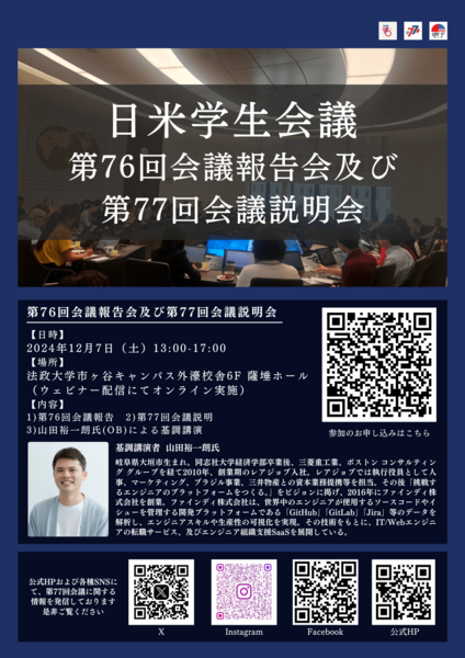 この度は、その成果のご報告及び次回会議の初回説明会となる「第76回日米学生会議報告会及び第77回日米学生会議説明会」を対面開催する(オンライン参加も可能)運びとなりました。