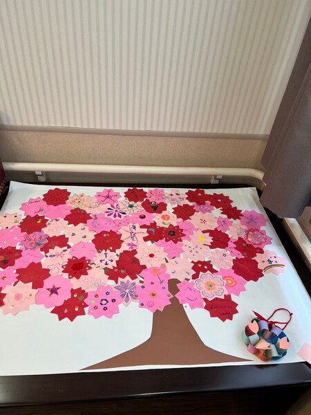 外国人留学生と日本人運営メンバーが協力しながら、さまざまな種類の折り紙を作り、花束を模した台紙にぺたぺたと貼り付けて最後には美しい花束を完成させるというワークショップです!