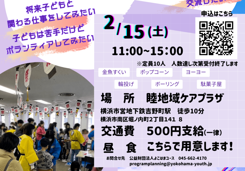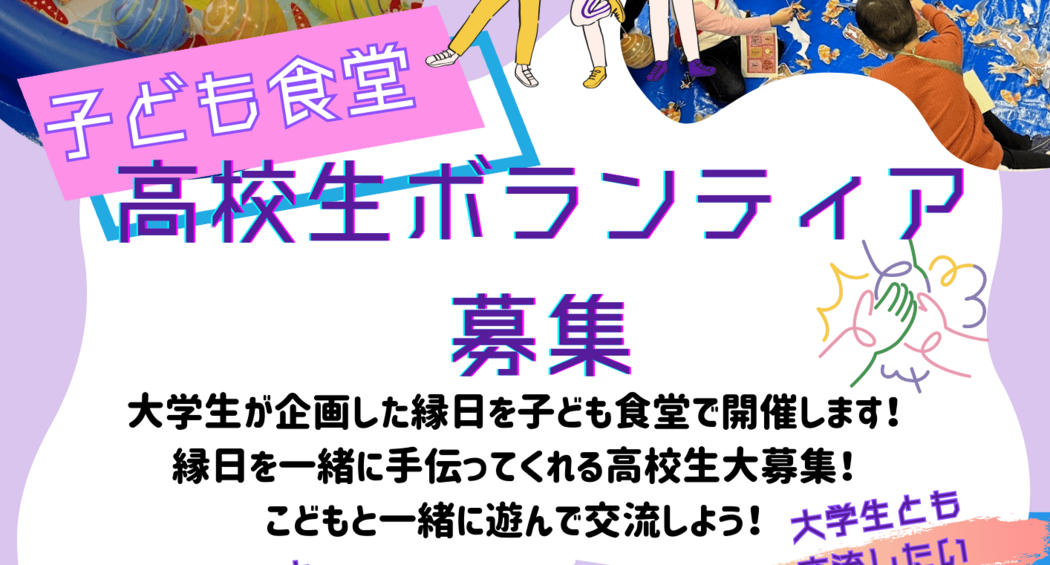 当日の縁日(出店)の運営とこどもとの交流をしてくれる高校生ボランティアを募集しています。