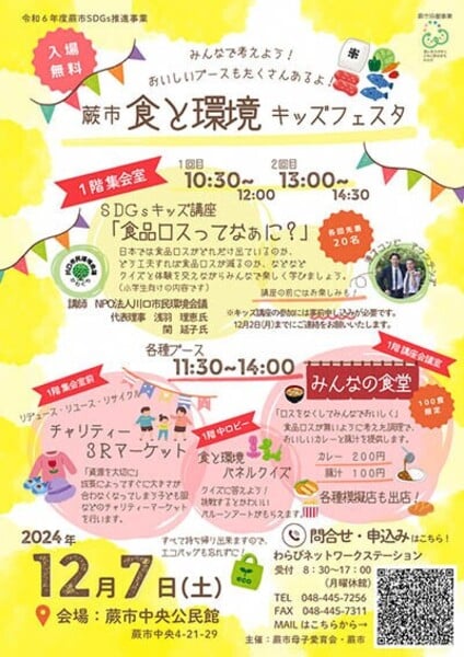 2024年12月07日に埼玉県蕨市で開催される食と環境キッズフェスタのお子様向けミニゲームを担当していただきます。屋内イベントのため、悪天候でも安心です。できるだけ近隣の方のご参加をお待ちしています。