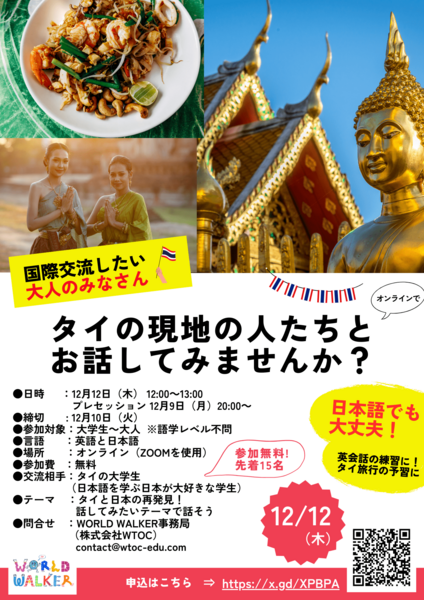 - 【大人・大学生対象】タイの現地の人たちと国際交流しませんか?