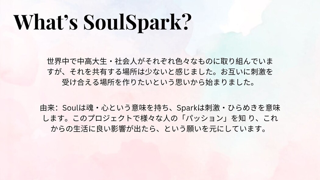 いろいろな物事に真剣にこだわりをもって取り組んでいる学生・社会人が交流できる場を作りたい、という高校生の思いがきっかけとなって始まった、Souls Sparkというオンラインイベント・交流企画です。