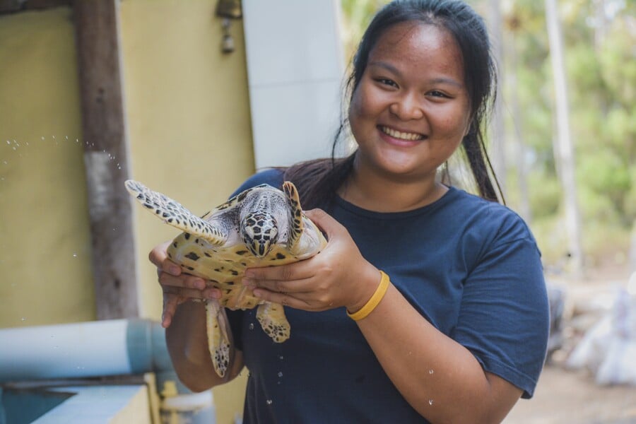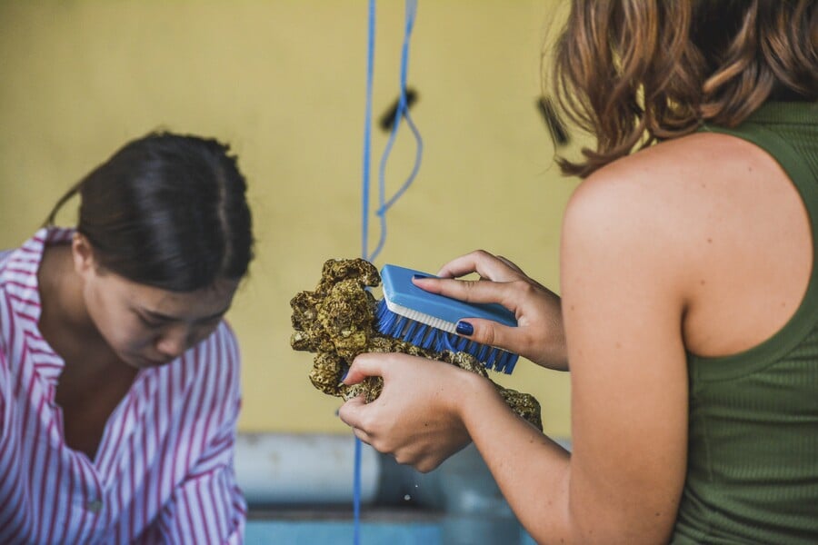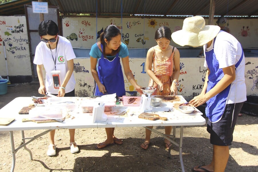 朝食後、タンクの清掃、ウミガメへの餌やり、海藻や生き餌の収集を行います。また、ウミガメ用のおもちゃを作り、怪我をしているウミガメには薬を与える活動も行います。