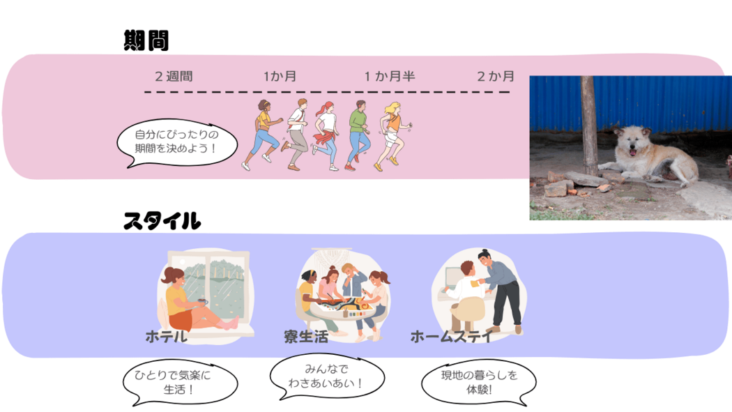 ご自身の予定に合わせて、2週間〜2ヶ月の留学期間を設定できます。 |