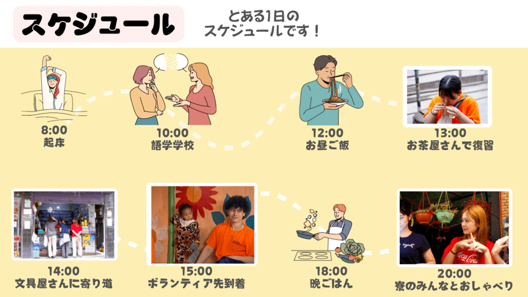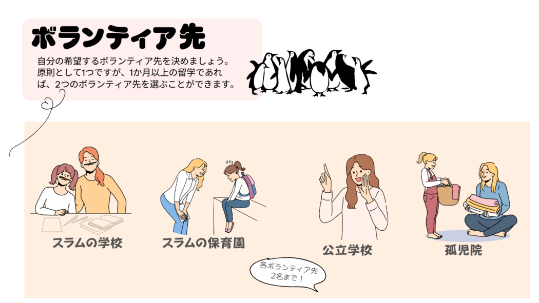 午前中に語学学校に通い、午後はボランティア先で活動します。スラムや孤児院など、支援団体であるHĀWĀが関わりを持つ施設で、安全に楽しく活動することができます。