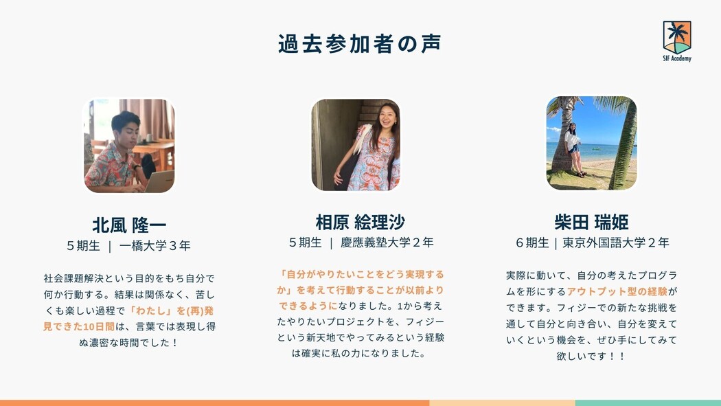 SIF Academyの1番の特徴とも言えるのは、フィジーでの短期滞在を、自分の過去・未来の人生にげて学びを深めていくこと。プログラム全体を通して、キャリアカウンセラー監修のコンテンツで自己分析や振り返り行いながら、自分のこれからの人生やキャリアにつなげます。
