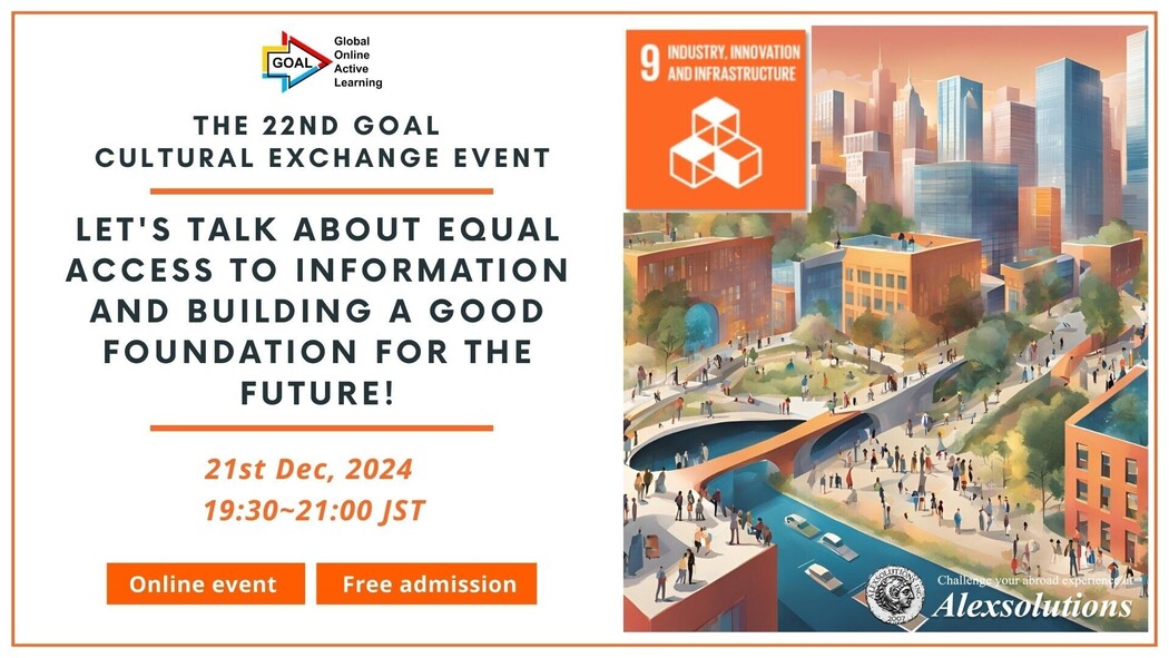 この国際交流イベントは、アレックスソリューションズが主催するグローバル人材育成プログラム「GOAL」の第22回発表会として行われます。