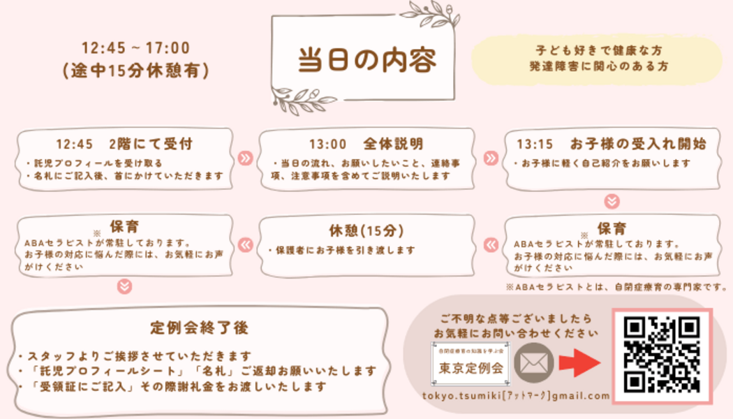 定例会では、藤坂代表やセラピストによるセラピーデモや、ABAに関する講義を受けられるほか、会員同士の交流会もあります。ここで同じABAに取り組む者同士、話の合うママ友、パパ友を作ることができます。