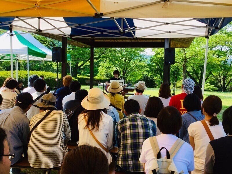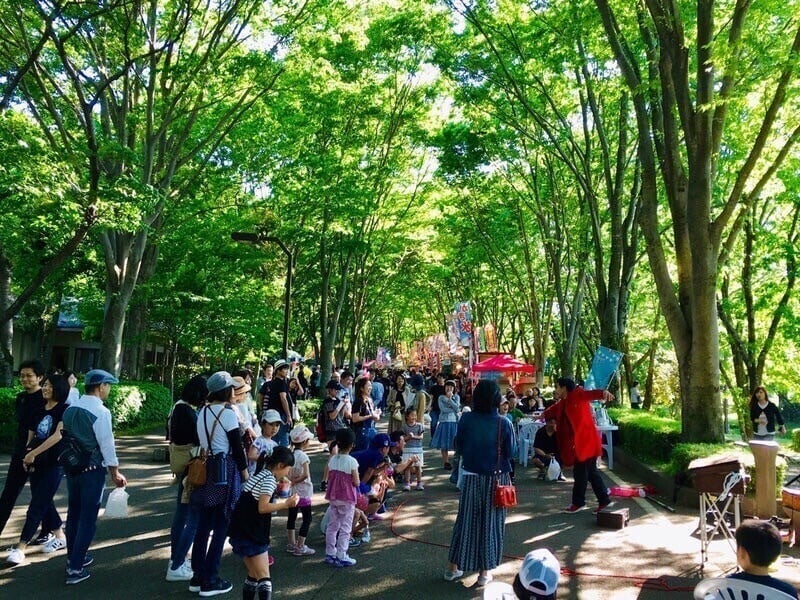 福島県内の物産ブースや、ダンスやパフォーマンスなどのステージと共に手づくり品のブースが初夏のあづま総合運動公園を彩ります。