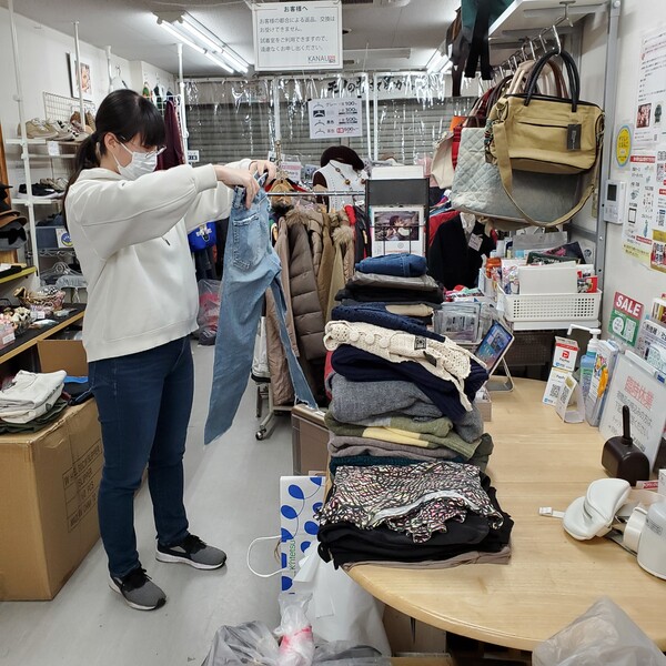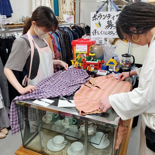 多くの方から寄付された1点ものの古着や雑貨などをチャリティショップで販売。ここでは、販売できるよう寄付品の検品や仕分けをし、物のリユースを進める環境ボランティア活動です。
