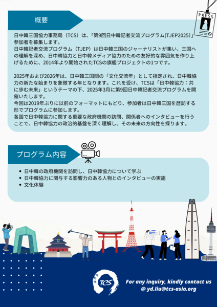 日中韓三国協力事務局(TCS)は、「第9回日中韓記者交流プログラム(TJEP2025)」参加者を募集します。