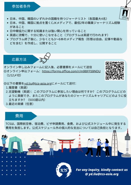 - 参加条件:2年以上の職業ジャーナリズム経験者、日中韓いずれかの国籍の保持、プログラム終了後少なくとも3~6本のメディア報告を公開する(形態自由)