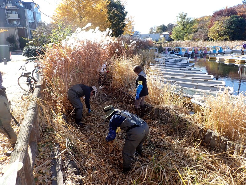 今回のイベントで作業した場所は、石神井池の最上流部でヨシが堆積し、湿地にしては表面が乾燥していました。