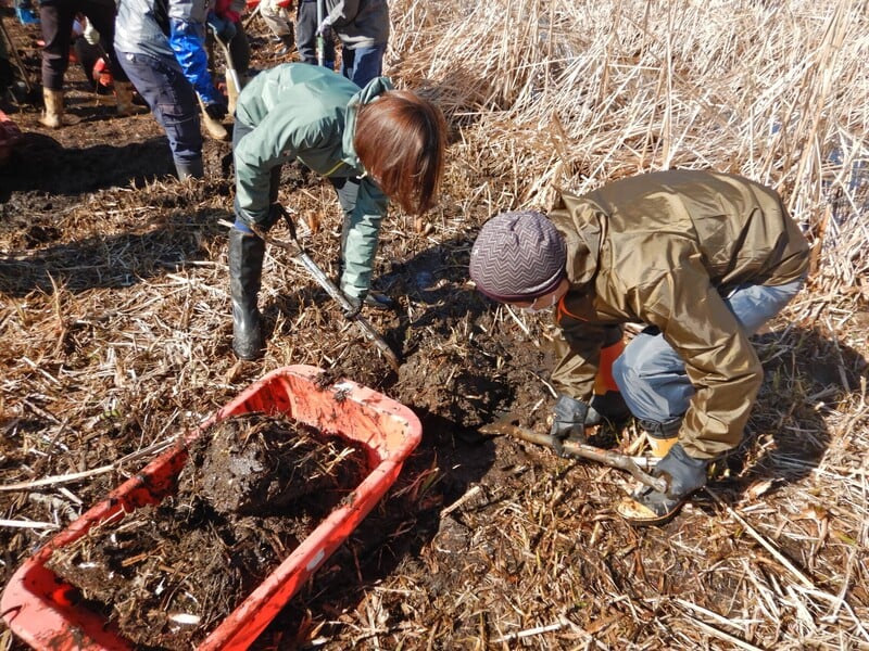 草を刈ったり、乾いた土を掘って湿地を再生しましょう!
