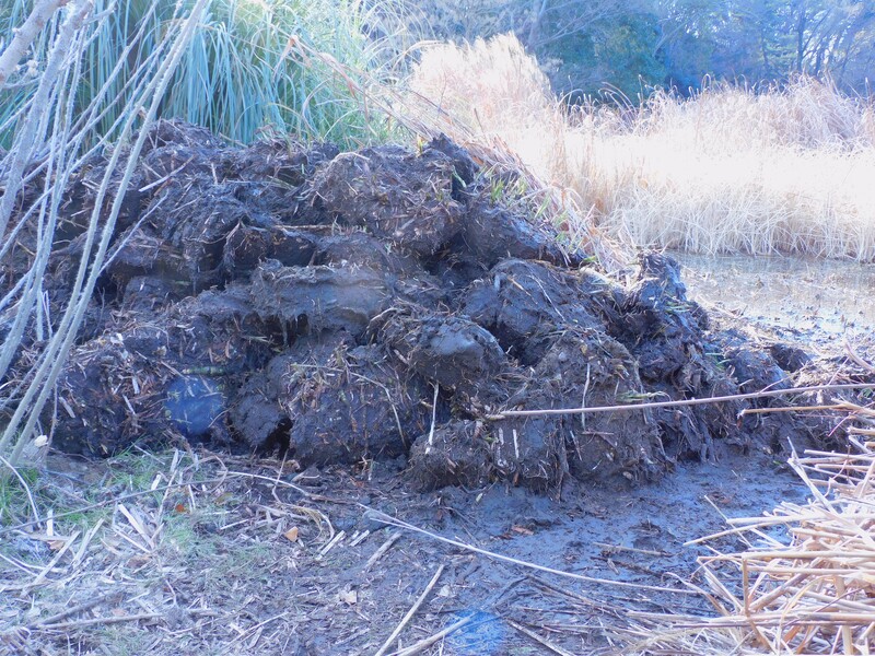 夏は池畔で青々と生育しているヨシやガマなどの植物も、やがて枯れてどんどん堆積してしまいます。