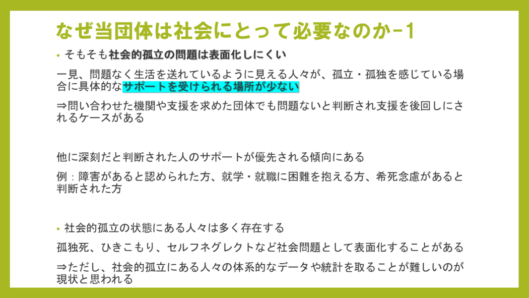 設立者も、現在まで同じような境遇であり、当事者としての危機感も覚えつつピアサポートのような支援をしていきたいと考えております。こうしたピアサポーターの輪が増えていくことで社会的孤立の解消に一矢報えるのではという狙いがあります。