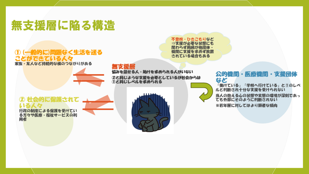 最初のきっかけは些細なことが多いのが社会的孤立です。些細なきっかけから社会的に孤立してしまうことは誰にでも起こり得るものだと考えます。