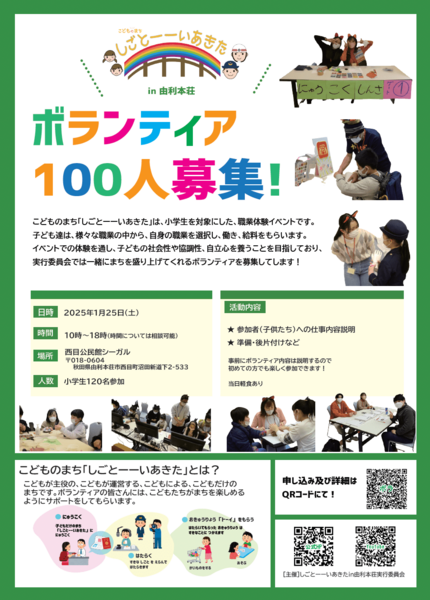 2025年1月25日(土)に開催する、小学生向け職業体験イベントこどものまち「しごとーーいあきたin由利本荘」で子どもたちが働くブースのサポートをしてくれるボランティアを募集しています。