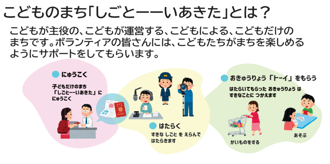 「しごとーーいあきた」は、「こどものまち」と呼ばれる子ども向けキャリア教育プログラムの秋田版での名称です。ドイツが発祥の「こどものまち」は、現在、日本国内の200カ所以上で行われています。
