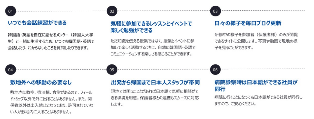 午前は「英語」または「韓国語」のレッスンを選び、「K-POPダンス」をプロの指導で楽しく学びます。午後は街に出て、現地の高校生との交流や企業訪問、民俗村巡りなど、韓国カルチャーをたっぷり堪能できるプログラムをご用意。初めての海外経験としてもお勧めです!