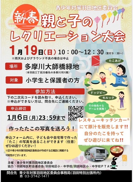 多摩川にて開催されにる新春イベントにレスキューキッチンカーが出店!フード販売のお手伝いや、お子さんと食育や防災、SDGsのクイズをして一緒に楽しみましょう!キッチンカーの運営に興味ある方も大歓迎!
