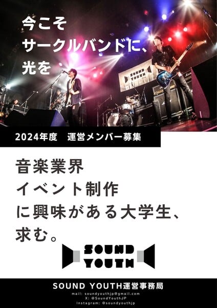また、私たちは学生バンドの活動の場を提供するだけでなく、学生バンドが音楽業界を再燃させるようなカルチャーを創出したいと考えています。このようなビジョンに共感し共に活動を広げてくれる学生を募集しております!!