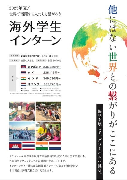 2025年夏、偏見を壊し、グローバルな視点で挑戦するチャンスがここに!各国のプロフェッショナルが学生の活動をサポートし、現地での経験を通じて新しい価値観やスキルを磨け!