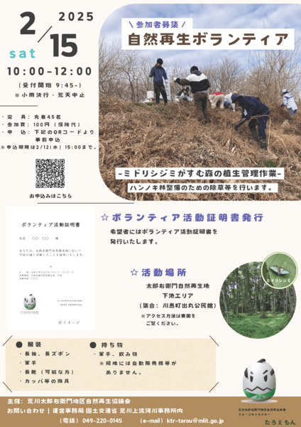 荒川流域の自然環境を取り戻すため、皆さんのお力が必要です。ぜひご参加ください!荒川太郎右衛門地区自然再生協議会の団体活動内容