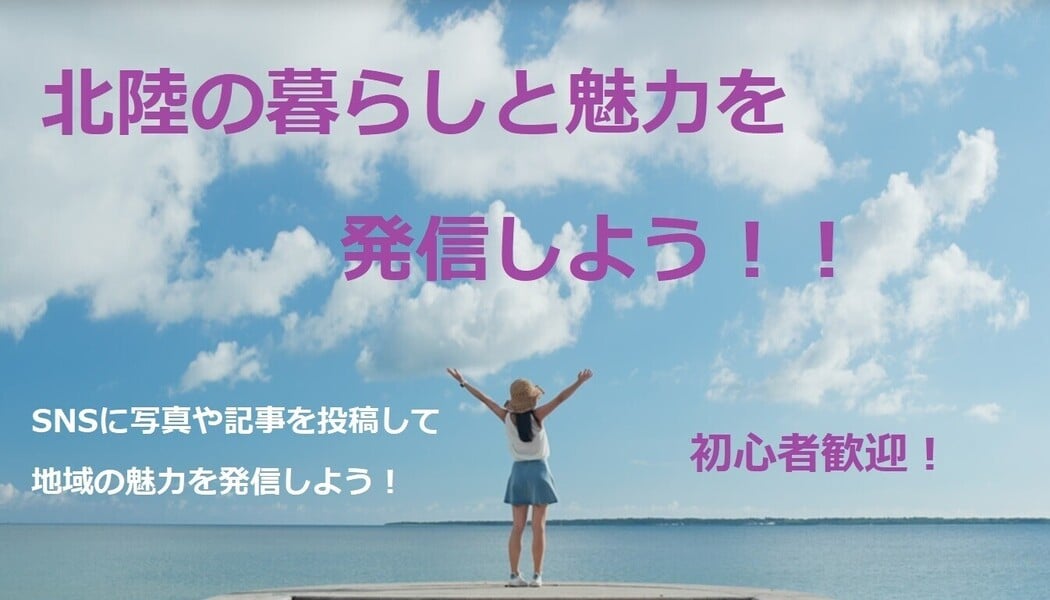 地域の魅力を発信するSNSサイトに写真や記事を投稿して北陸の魅力を発信しよう!地域の暮らしや観光、グルメなどの情報を伝えることで、地域のファンをつくり、町おこしや地方活性化に繋げていきます。