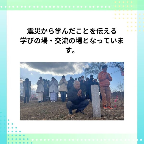 第三に上記の二点を踏まえて本震災において亡くなられた方々の御霊に祈りを捧げるのにふさわしい場所になり得る事です。