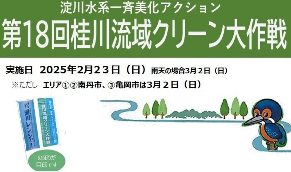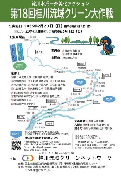 桂川流域全域で数千人の市民が一斉に清掃を行う年に一度の大イベント。2/23京都市以南、3/2南丹市亀岡市で開催、2/20までにお申込みを。地元の川を美しく、遠くの海をきれいに、お魚さんを元気に。