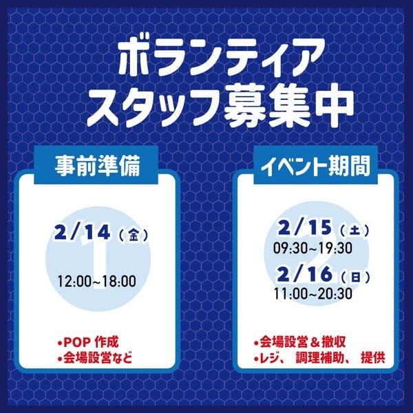 02/15(土)〜16(日)に下北沢で開催される岩手・宮城沿岸地の物産&🍴食&酒🍶イベントのボランティアスタッフ募集。ランチ&打上げ付🍻